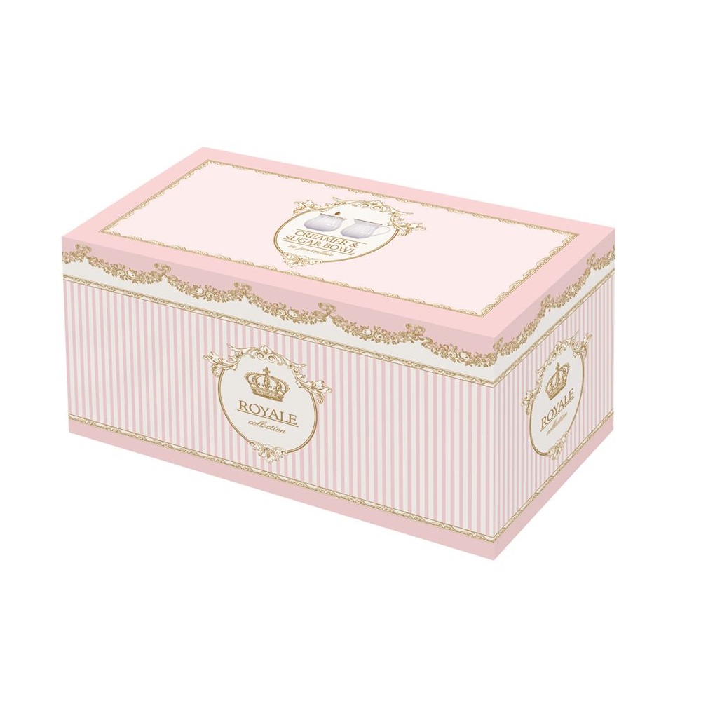 Zestaw porcelanowy składający się z cukiernicy i dzbanuszka na mleko z kolekcji ROYALE w kolorowym opakowaniu. Produkt wykonany ze średniej grubości porcelany, ze złoconymi brzegami. Nie nadaje się do mycia w zmywarce, ani używania w kuchence mikrofalowej. Wymiary: pojemność cukiernicy: 200ml, wysokość: 12 cm, średnica u góry: 6,5 cm, pojemność dzbanuszka na mleko: 200ml, wysokość: 9 cm, średnica u góry: 6 cm.