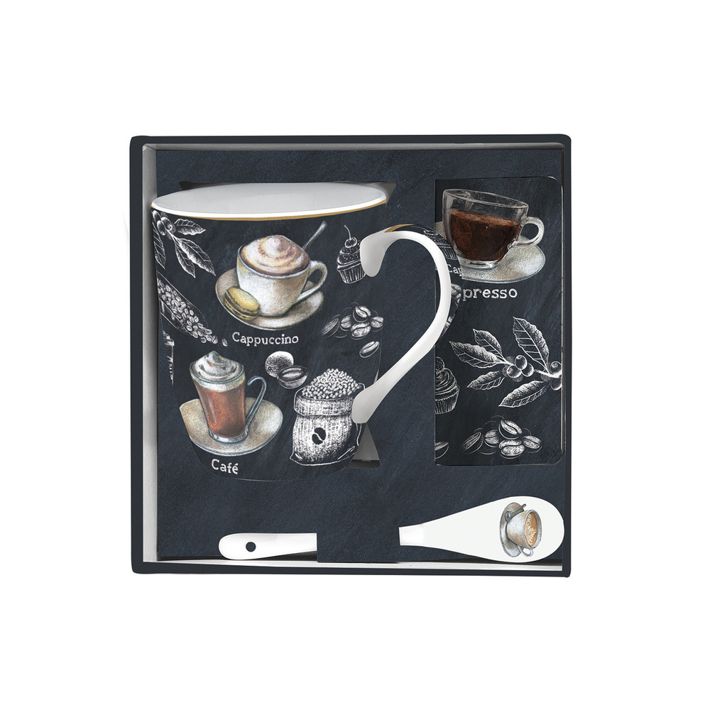 Kubek z porcelany z podkładką korkową i porcelanową łyżeczką z kolekcji BARISTA, w kolorowym opakowaniu. Produkt wykonany ze średniej grubości porcelany. Nadaje się do mycia w zmywarce i używania w kuchence mikrofalowej. Wymiary: pojemność: 300ml,