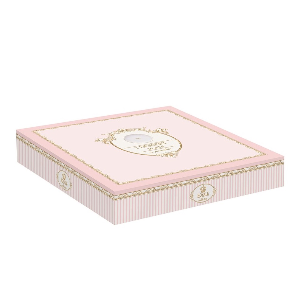 Porcelanowy talerz deserowy z kolekcji ROYALE w kolorowym opakowaniu. Produkt wykonany ze średniej grubości porcelany, ze złoconymi brzegami. Nie nadaje się do mycia w zmywarce, ani używania w kuchence mikrofalowej. Wymiary: średnica 19 cm.